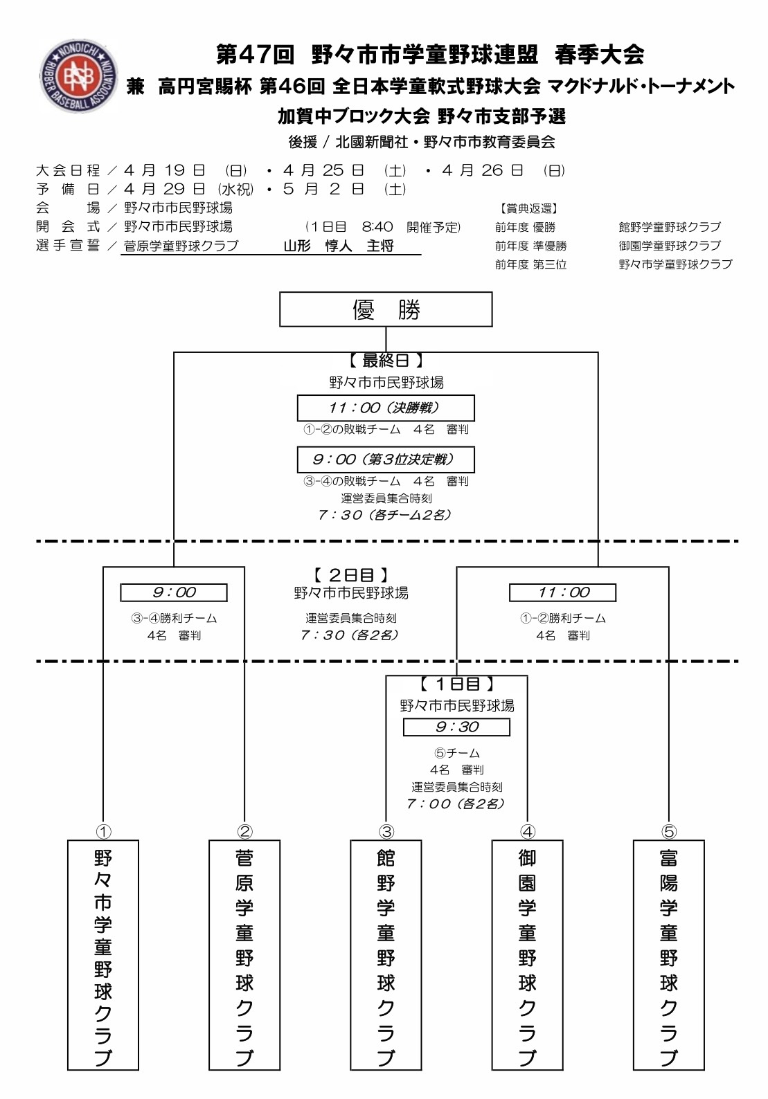 第47回 野々市市学童野球連盟 春季大会 兼 高円宮賜杯 第46回 全日本学童軟式野球大会 マクドナルド・T 加賀中ブロック大会 野々市支部予選.pdf PDFファイル 184KB ダウンロード |